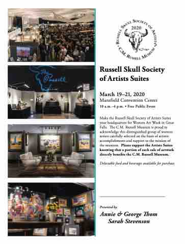 Make the Russell Skull Society of Artists Suites your headquarters for Western Art Week in Great Falls. The C.M. Russell Museum is proud to acknowledge this distinguished group of western artists carefully selected on the basis of artistic accomplishments and support to the mission of the museum. Please support the Artists Suites knowing that a portion of each sale of artwork directly benefits the C.M. Russell Museum.