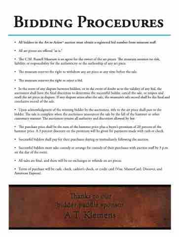 • The C.M. Russell Museum is an agent for the owner of the art pieces. The museum assumes no risk, liability, or responsibility for the authenticity or the authorship of any art piece.