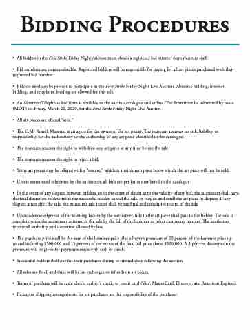 • The C.M. Russell Museum is an agent for the owner of the art pieces. The museum assumes no risk, liability, or responsibility for the authenticity or the authorship of any art piece identified in the catalogue.