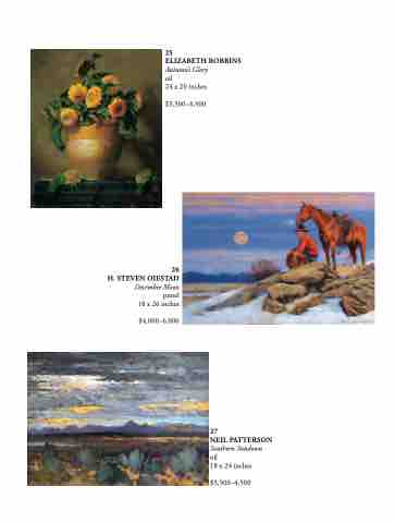 26 H. STEVEN OIESTAD December Moon pastel 18 x 26 inches $4,000–6,000 25 ELIZABETH ROBBINS Autumn’s Glory oil 24 x 20 inches $3,500–4,500 27 NEIL PATTERSON Southern Sundown oil 18 x 24 inches $3,500–4,500