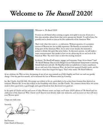 In the spirit of Charlie and Jay and scores of other Western artists, we hope you’ll enjoy 2020’s edition of The Russell and our celebration of the American West. I know you’ll discover new friends, make new memories, and encounter art that will move your Western spirit.