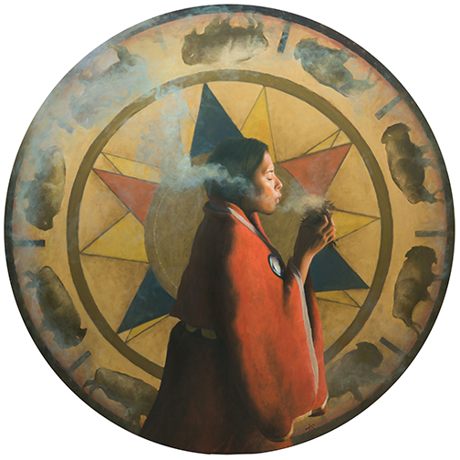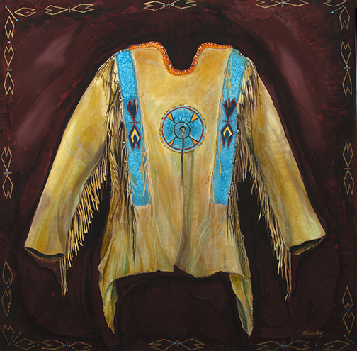 “Blackfoot Heritage” – This shirt was worn in a Blackfoot Sundance near Fort Belknap, Montana somewhere in the 1890’s. My family was invited to give support to the Sundancers near Mouse Canyon a few years back. When I read the provenance of this shirt, I felt moved to honor that tradition in this painting. Sundancers dance and pray for ALL of us.