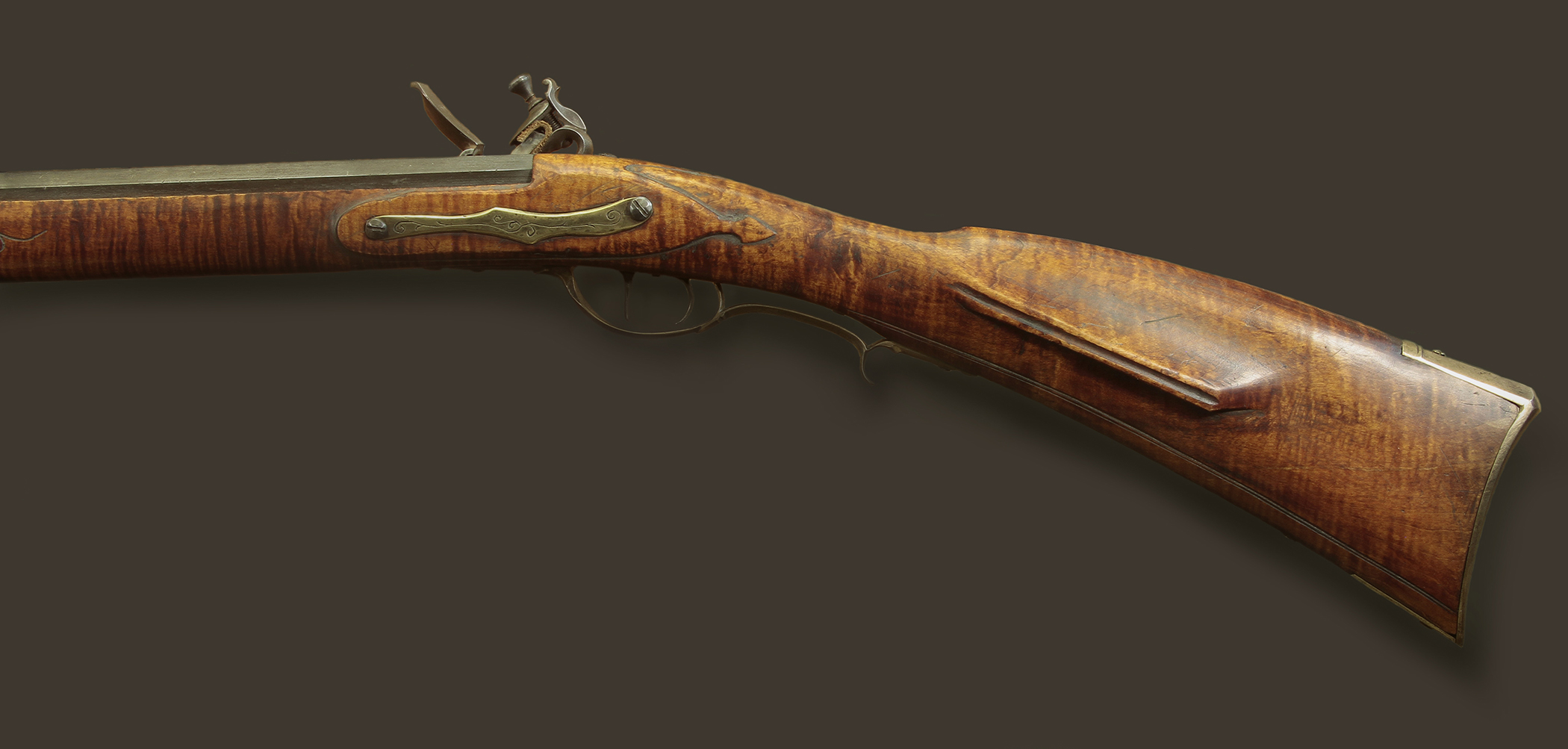 representative of rifles commonly carried during those eras. It features a hand-carved curly maple stock and antiqued to suggest careful use over time. Together I hope that the painting and the rifle speak to my love of tradition, respect for the land, the animal, and the enduring craft that binds them.