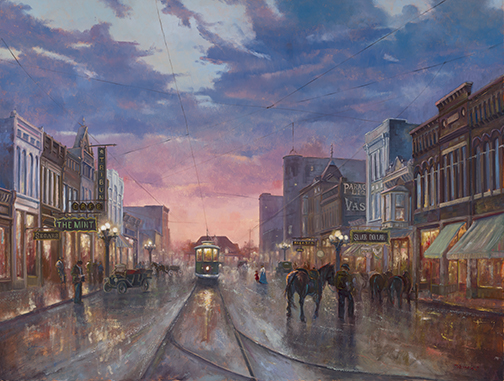 Sunset spills across Central Avenue in 1912, gilding brick façades, wet streets and the hum of the electric trolley car. Warm light pours from the Mint Bar and the famed Silver Dollar Saloon, two Great Falls watering holes Charles M. Russell is known to have favored. Their fronts glowing like lanterns against a setting sun. Charlie is to be seen walking his horse, Neenah, toward the Silver Dollar with a stack of small canvases tucked under his arm, a quiet, honest moment of the artist among the city’s evening bustle. Trolley wires lace the amber sky; shop windows hold the last golden minutes of the day. “Mint and Silver, a 1912 Glimmer” captures history and hush — the city that shaped a legend, and the legend who shaped the West.