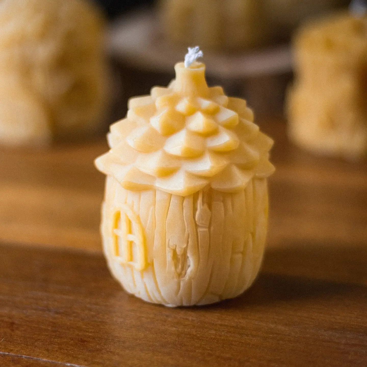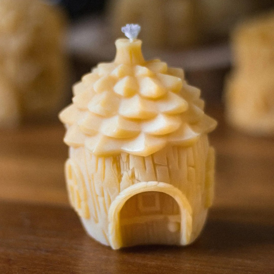 Pinecone shaped woodland tiny home. Made of pure beeswax and cotton wick.