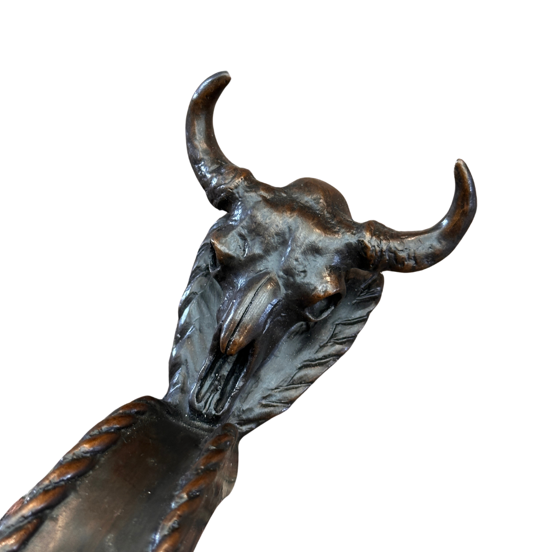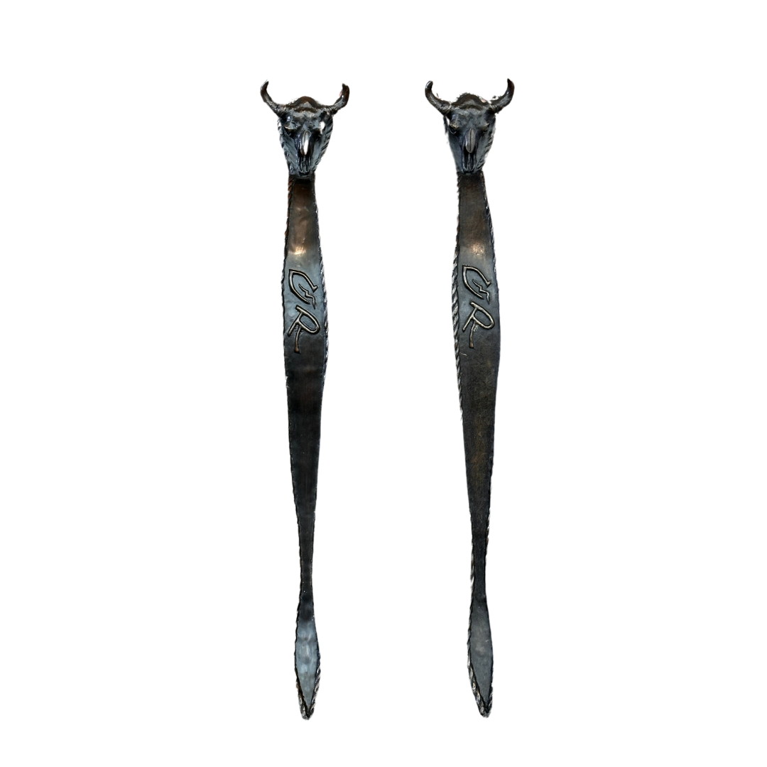 These handsome door handles are hand cast by sculptor Jack W. Muir. Each one with it’s own character, has the signature Charles Russell skull and “CMR” mold.