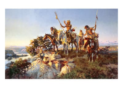 The Fireboat, exemplifies Russell’s use of mixing pigments to optimize color and anchor figures into a three-dimensional space. Compositionally, The Fireboat is a typical Russell portrayal of the Plains Indians perspective verses those of a white man. His use of small and authentic details like the middle rider using sign language for “fire” to signal to the others of the steamboat moving along Missouri River, accurately foreshadowing the changes to come.