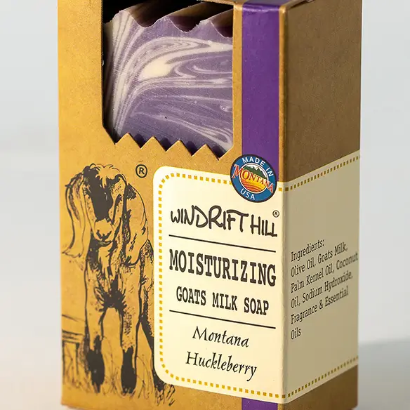 Montana huckleberry goat milk soap. sweet and juicy with just a hint of tartness, hands down a top-selling favorite. Don’t wear in bear country! A beautiful purple bar with white swirls. Windrift Hill soaps contain no preservatives, only naturally blended ingredients. We use only the highest quality essential and fragrance oils along with herbs and spices for texture and color. Unlike most mass-produced soaps, our handcrafted, cold-processed goat milk soaps retain all of the moisturizing glycerin that is formed. Each bar of soap is hand-cut and contains over one ounce of fresh goat milk. The bars will vary slightly in size and shape are not wrapped as being kept in the open air extends their shelf life. The aromas will become stronger when wet and you will notice that our soaps leave no soap film on your skin. Ingredients: olive oil, goat milk, sustainable palm kernel oil, coconut oil, sodium hydroxide, fragrance oil. Handmade in Montana, USA. Size: 5 oz. Scent: Montana Huckleberry.