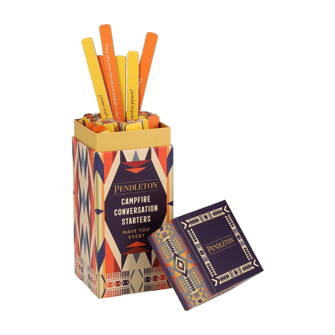 GREAT GROUP FUN: 200 engaging prompts to inspire entertaining conversation and bonding with family and friends! Packaged in a handy, portable box with a stunning Pendleton print, this all-ages game is perfect for sparking discussion around the fire on camping trips or making game night more lively. Pick a stick and read the question aloud for everyone to answer.