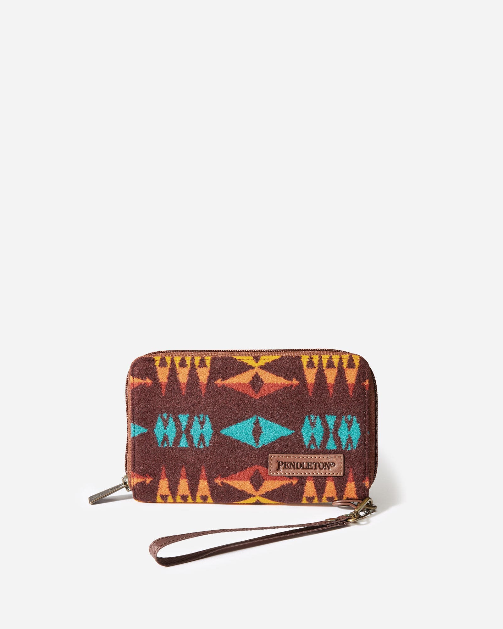 A convenient stash-all for you smartphone, with slots for currency, credit cards and ID plus a coin pocket. Zip-around closure keeps it all secure. Removable 6½” wristlet strap. Leather logo patch. Lined. Random pattern placement.