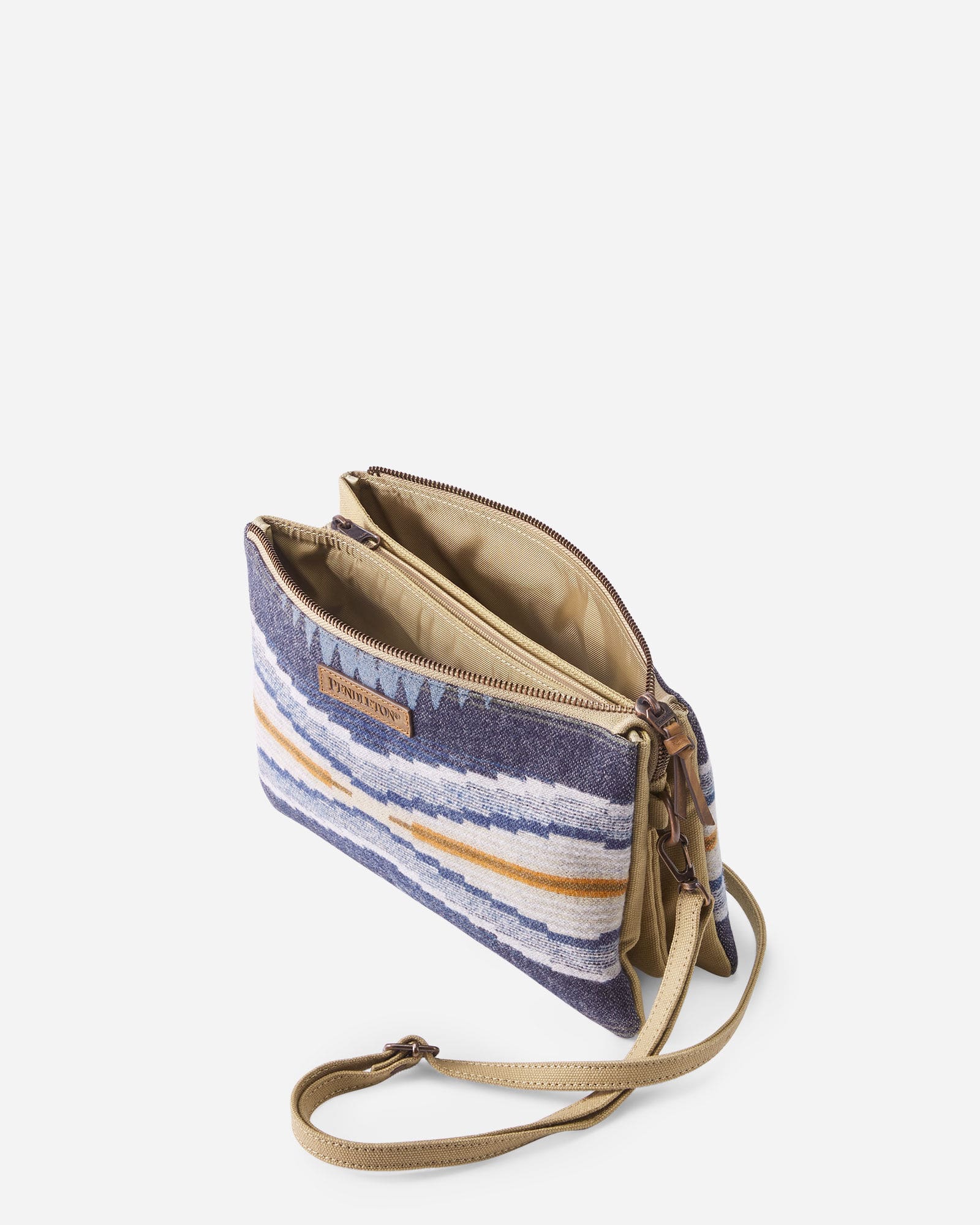 A trio of lined pockets are the perfect place to stash cash, credit cards, cell phone, key, lip balm and other small essentials. Outer zipper with leather tab; detachable 6½” wristlet strap. Crafted in the woven-in-USA wool. Random pattern placement.