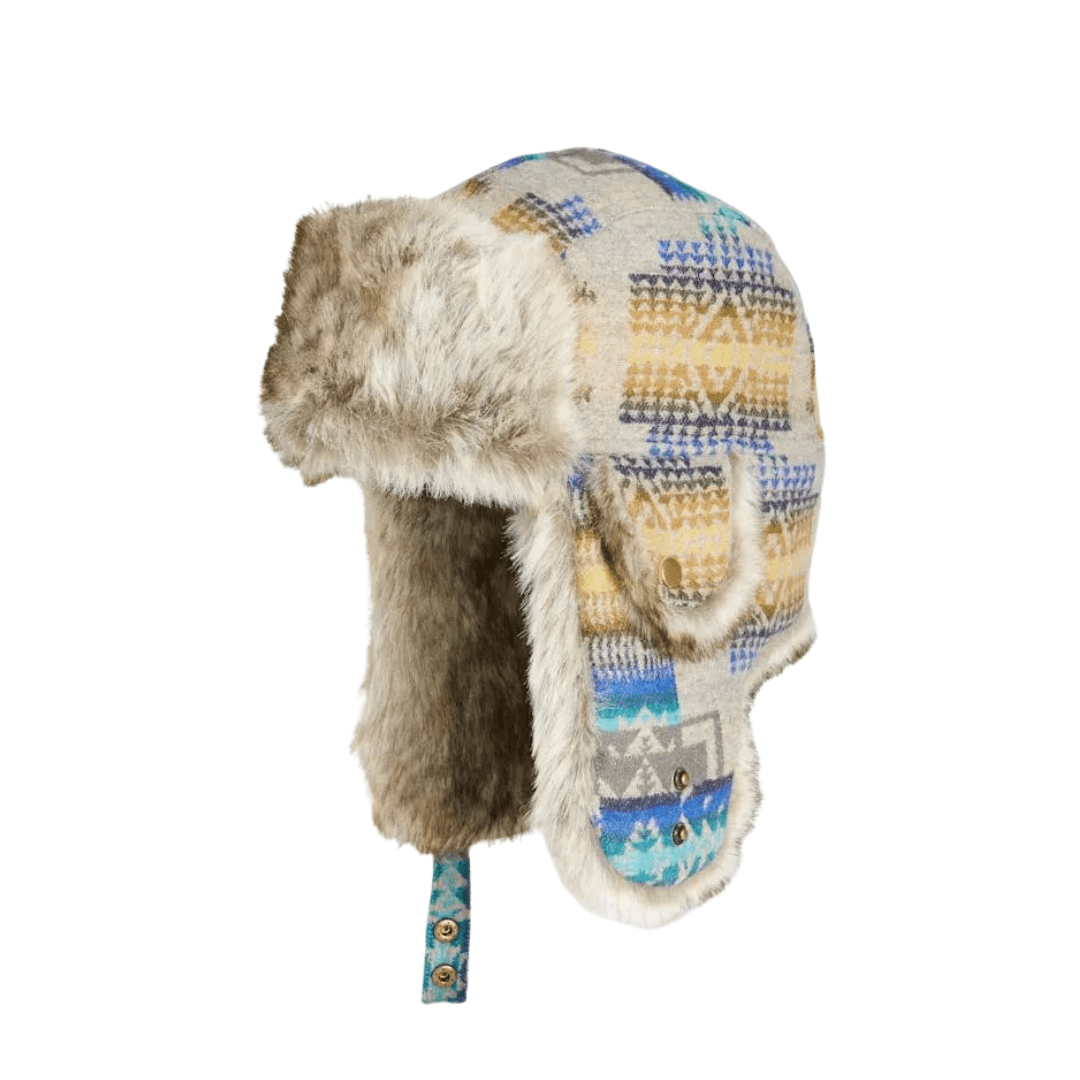 Warm winter hat crafted from our USA-woven wool, with front trim and snap-down ear flaps lined in faux fur. Chin strap with snap closure. Leather trim, acetate lining.