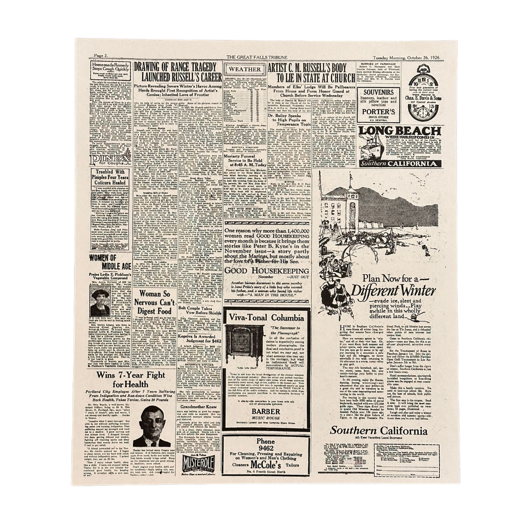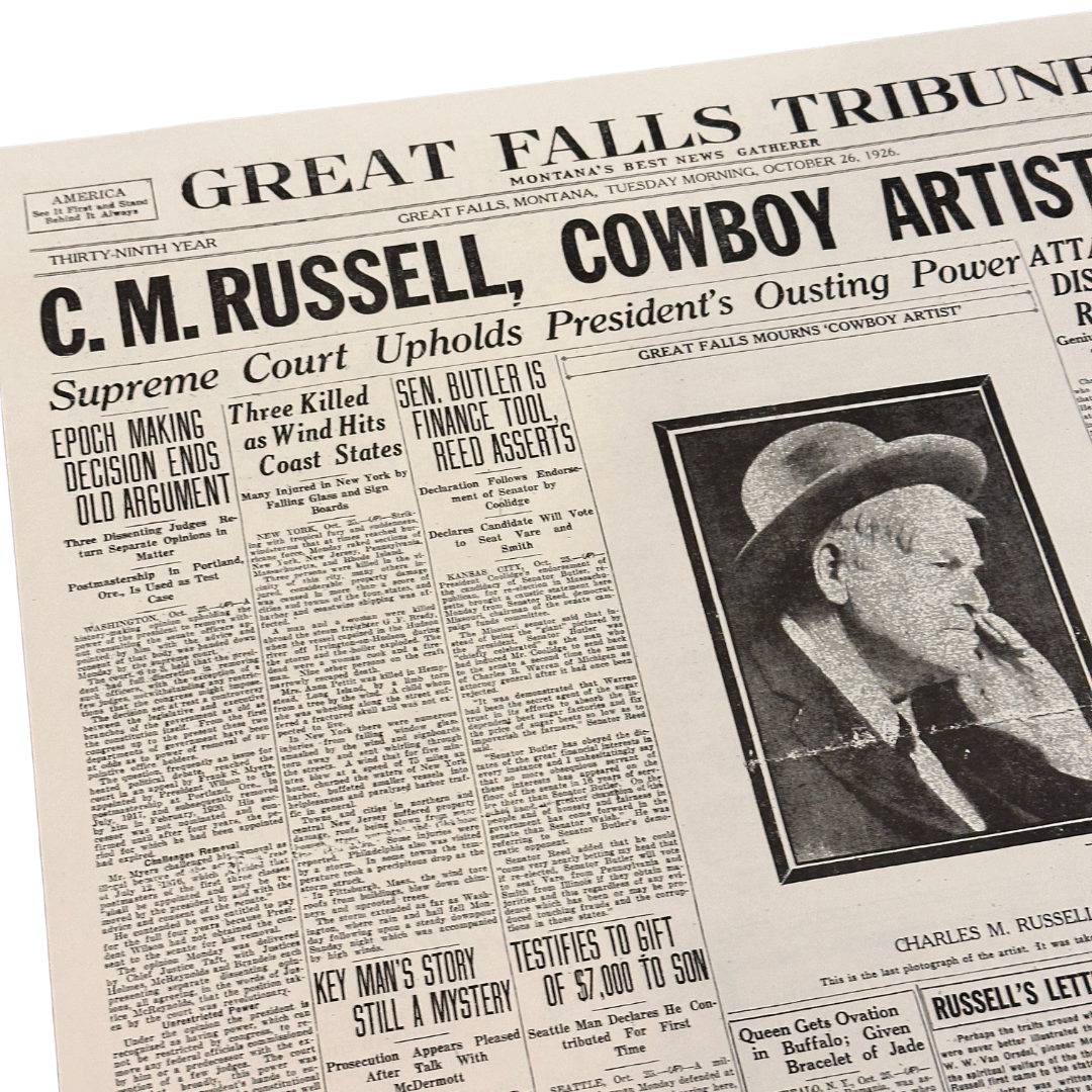 The day Charlie Russell’s death was announced to the community, it rocked the art world. This copy of the Great Falls Tribune front page, not only captures his obituary, but all the stories happening on October 26, 1926.