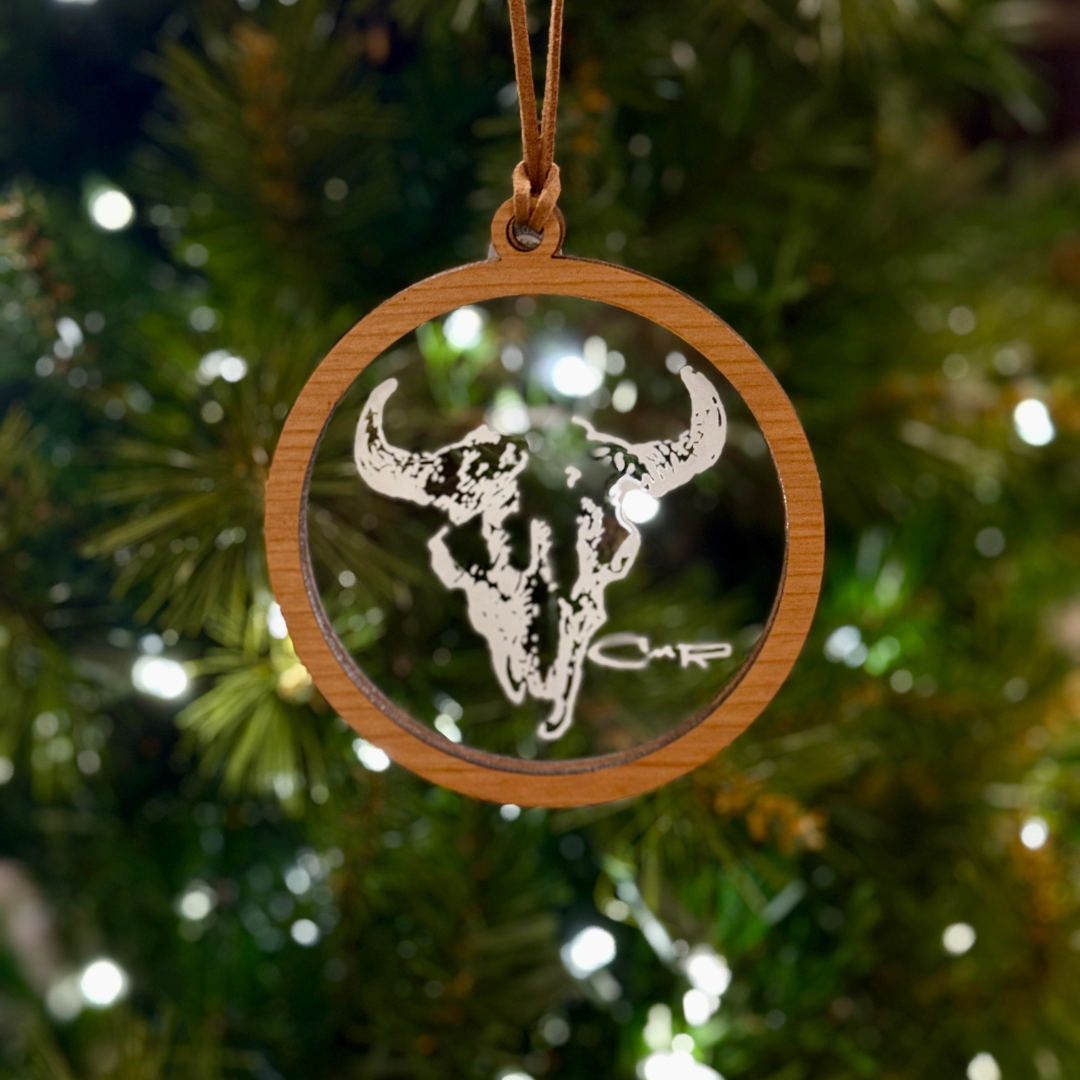 These gorgeous wood & acrylic, 3D cut ornaments have been made especially for us and are available at a limited quantity. They are hung with a sturdy leather and measure 4″ in diameter.